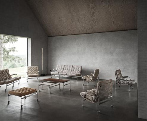 The classic, elegant Karin armchair was designed by Bruno Mathsson in 1969, becoming the first piece of furniture in a collaboration that would span several decades. As the cornerstone of this stylish collection, the Karin Easy chair offers comfortable stuffed cushions that rest on a chrome-plated frame with a supporting web. The Karin range also features a footstool and a table.