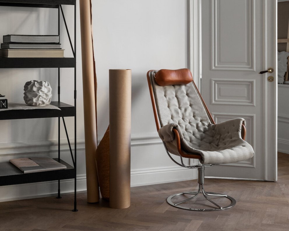 This is an iconic easy chair designed by Bruno Mathsson. The Jetson chair reflects both his obsession with comfort and a classic Swedish modern design approach. It features a bowl-shaped seat and an ergonomically designed high back with head pillow. It comes with a chrome swivel base with a unique self-return mechanism.