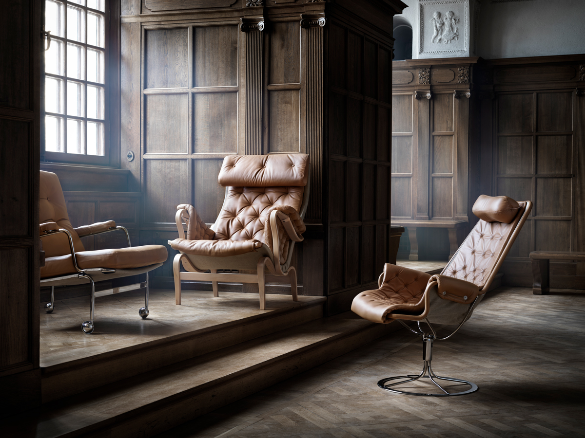 Classic easy chair designed by Bruno Mathsson. Ingrid is a sister to Karin, but in moulded beech wood. Ingrid has buttons on both the seat and the back cushion.